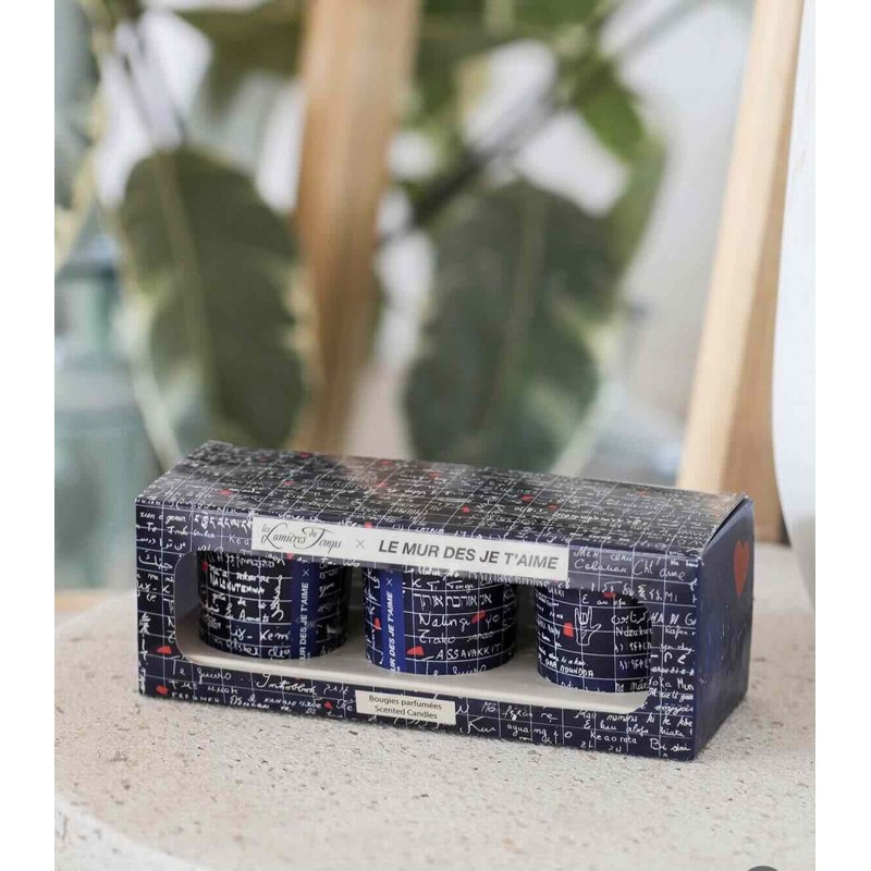 El muro de los te quiero Caja regalo con velas 3x90 g. Tres fragancias: Ámbar negro - Flor de algodón - Toque de malva
